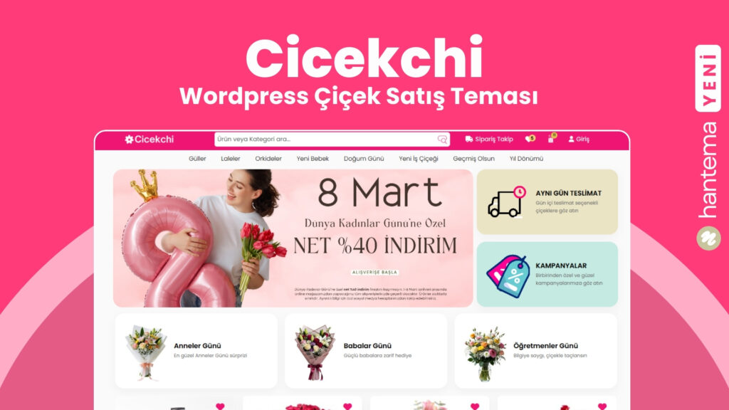 Çiçekchi, çiçek satış mağazaları, butik çiçekçiler ve online çiçek sipariş siteleri için özel olarak geliştirilen modern ve hızlı bir WordPress e-ticaret temasıdır. Hantema tarafından geliştirilen bu tema, WooCommerce altyapısı ile tam uyumlu çalışarak çiçek satış süreçlerini kolaylaştırır ve müşterilere premium bir alışveriş deneyimi sunar.